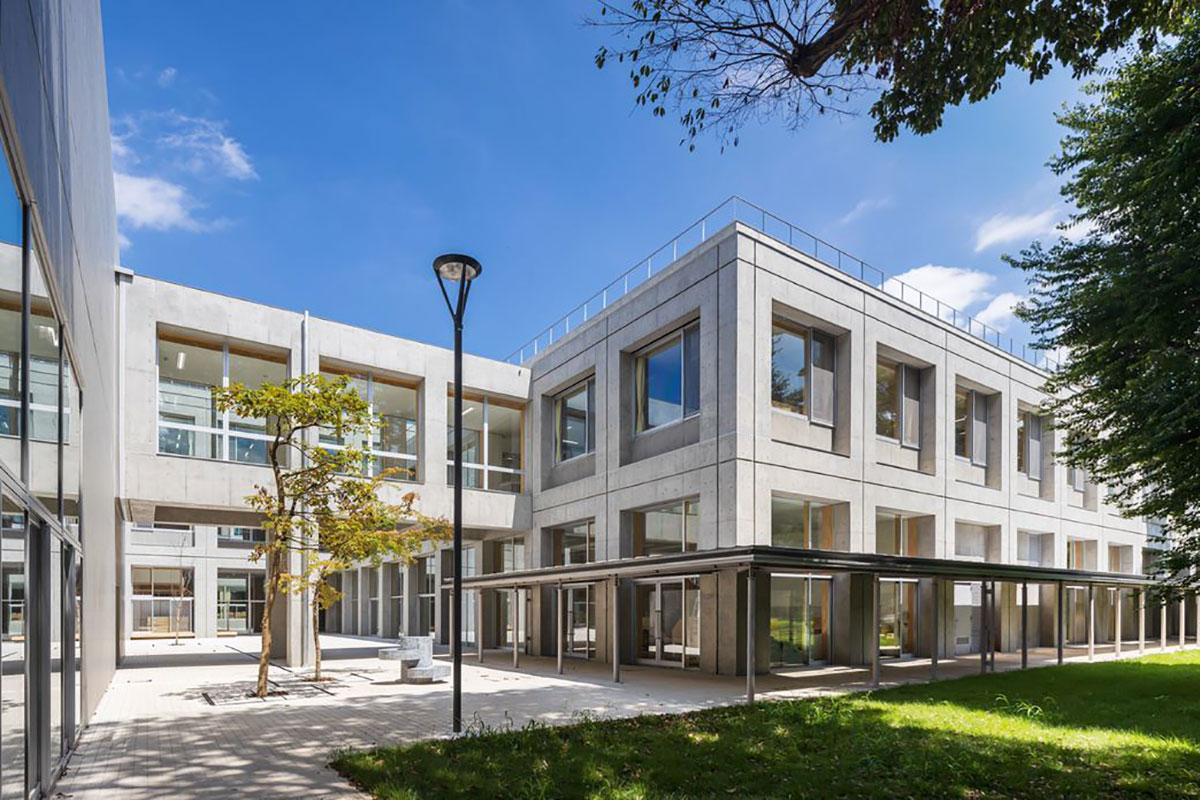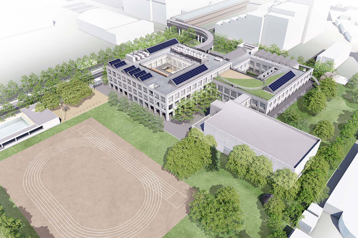 周辺環境や敷地内の緑と調和する、低層ののびやかな建物で、校舎の隅々まで光と風がいきわたる学習環境を形成します。